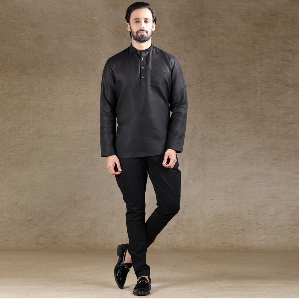 Full sleeves cotton Black color short kurta. Chinese collar, short length with straight hem, kurta has one top pockets. Short Kurta give you perfect fit and comfort. In trend Slimfit short Men's Kurta made from cotton with silky finishing so it gives you smooth feel with comfort to wear. The silky textured feel of the kurta adds to its regal style. True to its name Ajay Arvindbhai Khatri delivers products with perfect quality and finishing.